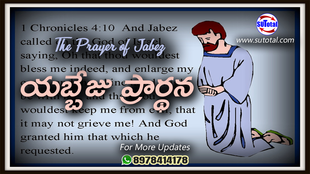 యబ్బేజు ప్రార్థన. ప్రపంచ వ్యాప్తంగా క్రైస్తవ ప్రపంచములో అత్యధిక జనాభా ఎక్కువగా ఇష్టపడేది యబ్బేజు ప్రార్ధన. 2000 సం.లో ”ది న్యూయార్క్ టైమ్స్” ప్రచురించిన కధనం ప్రకారం బ్రూస్ విల్కింసన్ అనే వ్యక్తి వ్రాసిన ది ప్రేయర్ ఆఫ్ జాబెజ్ అనే ఆంగ్ల పుస్తకం సుమారు 90 లక్షల కాపీలు అమ్ముడయి ప్రజాదరణ పొందినది. ఇంతకీ యబ్బేజు ప్రార్థనలో ఏముంది? పరిశుద్ధ గ్రంథములో యబ్బేజు ప్రార్థన అంత ప్రాముఖ్యమైనదా? ఈ వివరములన్నియు ఈ సందేశము ద్వారా తెలిసికొనగలరు.